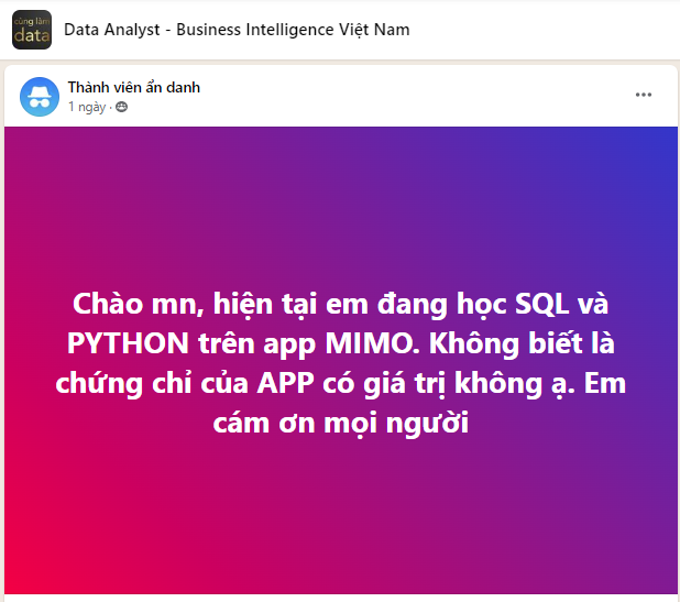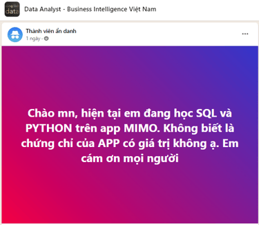 Thường các app hay nền tảng cung cấp khóa học online đều cung cấp chứng chỉ nên đều có giá trị thôi e nhá. Các khóa càng nổi tiếng trên nền tảng nổi tiếng thì càng có giá trị nha. Bên cạnh MIMO, còn nhiều nền tảng dạy Data thực chiến khác như Udemy (ngon bổ rẻ), Linkedin Learning (tính theo tháng chứ ko theo khóa nhưng cơ bản nếu mình học tập trung thì rẻ), Coursera (có khóa free nhưng kiến thức hơi hàn lâm).
