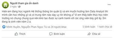 Ngành MIS (Management Information System) e đang học thì có lợi thế là sẽ dạy chuyên môn về các hệ thống quản lý thông tin trong các đơn vị kiểu như hệ thống ERP (Enterprise Resource Planning), hệ thống CRM (Customer Relationship Management) và cả các phần mềm bắt buộc phải có như phần mềm Kế toán... Như thế về lý thuyết thì e sẽ được học 2 phần chính quan trọng nhất của Data analyst là nghiệp vụ (thuộc về KIẾN THỨC) xung quanh các hệ thống phổ biến này và các tool (thuộc bộ KỸ NĂNG) để truy vấn và phân tích với data như SQL hoặc các ngôn ngữ lập trình để hiểu hơn về cách hoạt động của các hệ thống.