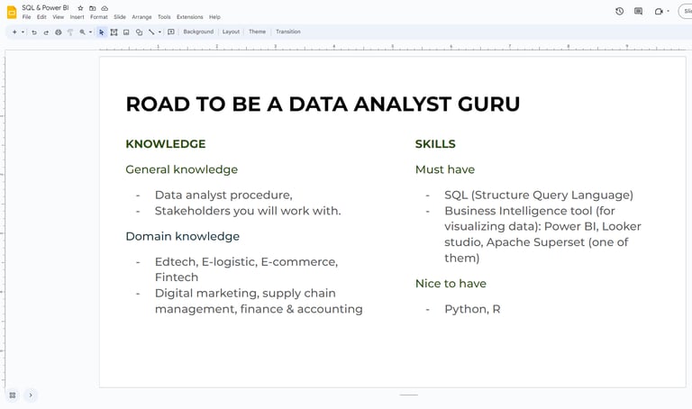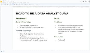 A có làm 1 slide về ROAD TO BE A DATA ANALYST GURU nè. Nếu e muốn học hỏi các khía cạnh lý thuyết kèm thực chiến tại doanh nghiệp về Data thì follow hoặc kết bạn a nha. Wellcome e.