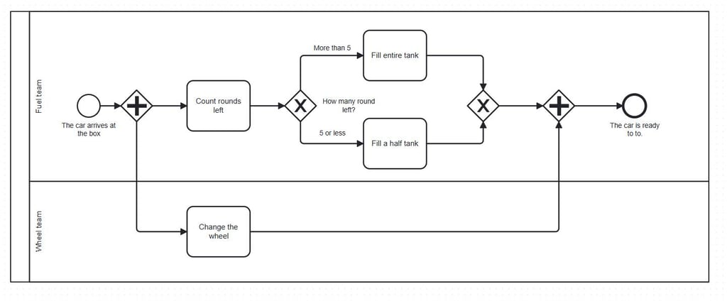 Ví dụ: Một BA có thể sử dụng BPMN để lập bản đồ các bước trong quy trình đổi bánh xe và bơm xăng trong 1 cuộc đua, từ đó tối đa hoá lợi ích, tối thiểu hoá thời gian và có một "cuộc đua" thuận lợi.